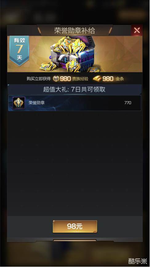 “荣誉勋章补给”价值98RMB,购买即可获得980金条,且在7日内共可领取770个荣誉勋章,算下来平均每个0.12RMB。