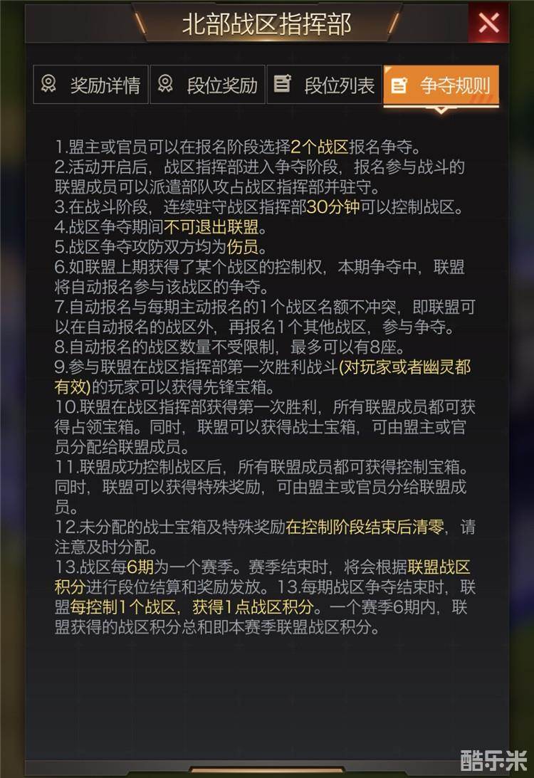 每占领一座战区,会获得1积分,新版本的战区初始可以报2个,占领后下一周可以增加2个。依次进行,极限状态下4周便可以占领所有的战区。但每个赛季只有六周。 王者军(积分需求36分):例如一个超级联盟,第一周占领2个战区,获得了2积分,第二周保证原本占领的不被抢走再占领2个战区,便可以获得4积分,第三周继续保持可以获得6积分,第四五六周都是8积分。那么赛季结束,这个联盟的积分刚好可以达到36积分,获得王者军的称号及奖励。但是王者军,在一个区中,最多也只能有一个联盟夺此桂冠。如果没有联盟到达36分,那只能在下一个赛季好好努力了。