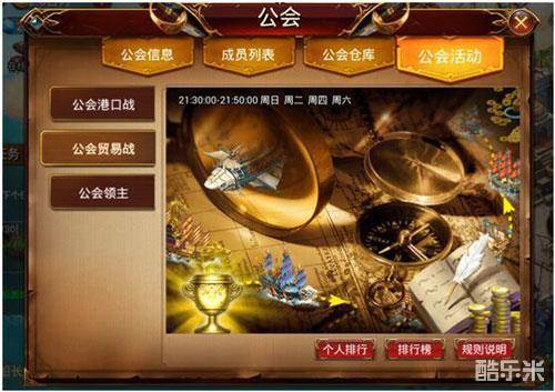每周一、三、五半个小时的公会港口战是十分刺激的激战体验。总战场会分为很多点,各自为自身公会而战,占领的点地图会呈现绿色,中立港口为灰色,敌方公会占领的为红色。要注意的是复活次数是有限的,所以各位船长要利用好每次机会多为公会打下港口哦~每次前十才有奖励哦!