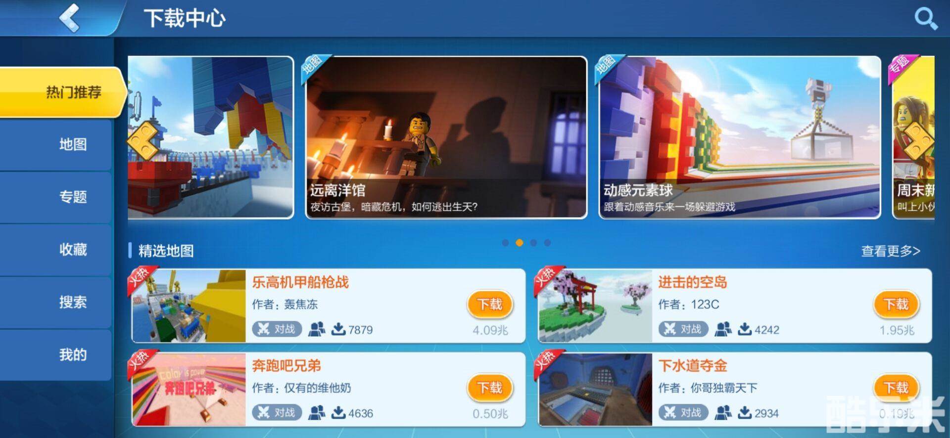 说到了地图下载,《乐高®无限》专门设计了下载中心,并对热门玩法进行推荐。与此同时,我们也可以通过玩法类别筛选,寻找自己感兴趣的地图。令人颇为动心的是,下载中心除了展示地图名称、缩略图外,作者名字与下载量,也在醒目位置。
