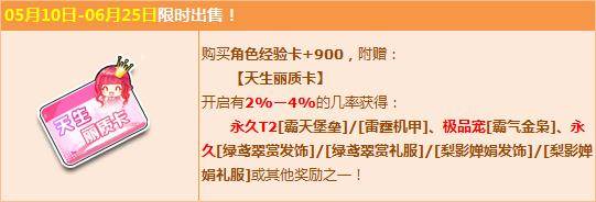 5月10日-6月25日期间,购【角色经验卡+900】,赠送【天生丽质卡】,有机会得永久T2【霸天堡垒】/【雷霆机甲】,极品宠【霸气金枭】,永久【绿鸢翠赏发饰】/【绿鸢翠赏礼服】或其他奖励之一!其中核心奖励期限型概率为4%-6%,核心奖励永久型概率为2%-4%,非核心奖励概率为90%-94%。