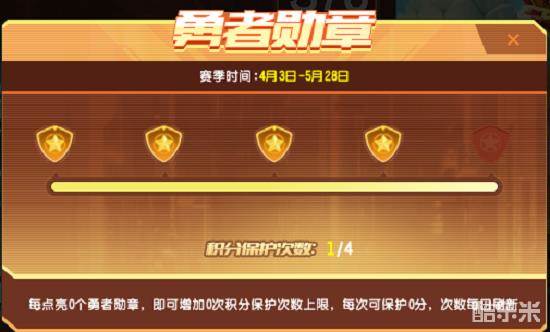 每完成一个指定的赛季任务,即可点亮一个勇者勋章,同时增加1次每日段位积分保护的次数上限。当段位积分结算为负时,可触发一次积分保护,并消耗1次保护次数,次数每日刷新至上限。(注:勇者勋章对技术大师和技术车神不生效)
