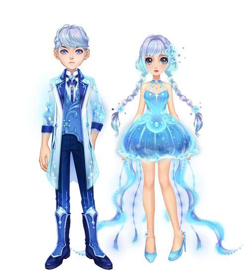 美丽的海底世界总是无比的吸引人,如果你喜欢探寻海底世界,那不妨先来看一下这套新套装吧!荧光蓝色的套装,闪烁游动的粒子,如同海底世界一样神秘,尤其女生的裙子外层还会微微的扩张收缩,像游动的水母一般,裙摆下长长的飘带轻柔摆动,更加婀娜多姿。