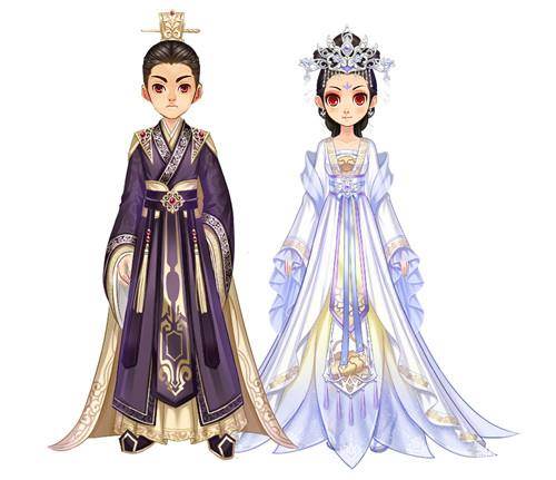 贵族套装又添新成员啦!女生华丽的帝后造型,紫色与金色的颜色搭配彰显着皇家荣耀,繁重的发饰更加庄重高贵;男生是深色的帝王套装,发髻高高梳起,祥云图案的披风垂地,肩部与腰间都装饰着红宝石,更显皇家富贵荣华。帝王与帝后套装等你来领取哦!