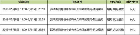 2019年5月8日 11:00-5月15日 23:59,抽到指定的暗月系列部件,即可领取暗月系列奖励部件,千万不要错过!