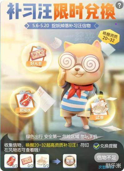 5月6日-5月20日期间,御灵师在成功捕捉任意妖灵时,都会有大概率掉落补习汪信物【肥宅快乐水】、【好人卡】以及【试卷】,单个信物每日获取上限为6个。