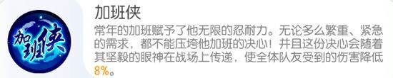 加班侠,使全体队友受到的伤害降低,满级技能可减免12%受到的伤害,能够显著提高队伍的生存能力!加班侠,磨炼自己,激励他人!