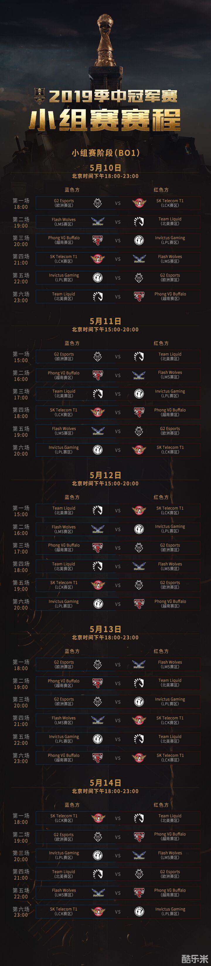 在5月10日当天,iG战队将先后与PVB以及G2战队展开交锋,5月11日则将对决TL战队以及SKT战队,与FW的首次对决在5月12日,之后iG与每支战队还有一轮交锋,在两轮交锋之后,将角逐出四强名额,并在半决赛中角逐总决赛名额。