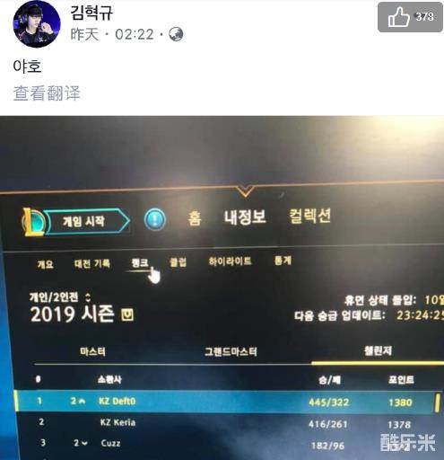 今日Deft在社交网站发布了一张照片,内容是自己又登上了韩服第一,而Cuzz则被挤到了第三名的位置。