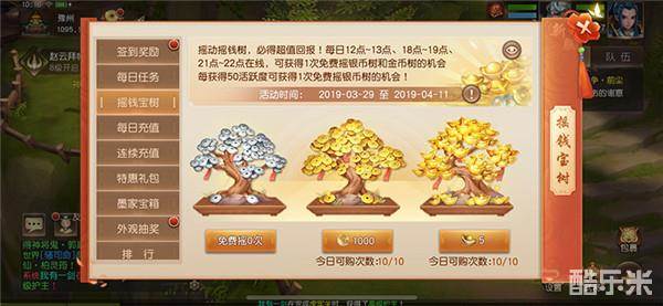 三颗摇钱宝树降临新服,玩家只要摇动宝树,即可获得银币、金币、道具或元宝奖励。银币树每日可通过在线和活跃度获得摇树次数;金币树每日可通过在线和购买获得摇树次数;元宝树每日可通过购买获得摇树次数。奖励价值必然高于购买价钱,稳赚不亏!