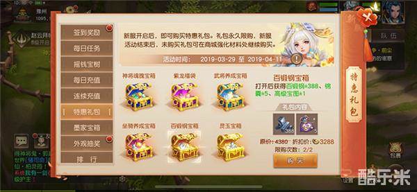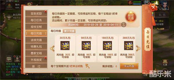 每日充值达到不同额度,即可获大量幸运宝箱,自由选择心仪的道具奖励。每个幸运宝箱还加送1把幸运钥匙,可从幸运转盘上抽取随机神将、木牛流马、乾坤风火轮、引魂笛、元宝在内的丰厚奖励。天选之人更有机会获得财神祝福,赢得双倍元宝道具奖励!