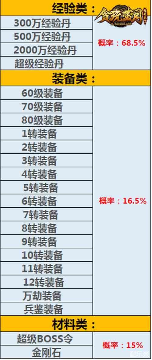 通过购买寻宝钥匙进行寻宝,您将有机会获得经验丹,各等级装备,BOSS令等等稀有道具。同时寻宝后将会累计宝藏积分,宝藏积分也可以兑换稀有装备或者材料。虽然寻宝是一种比较奢侈的玩法,但是一旦抽中那就是从地上到天边的变化啊,而此次我们也对寻宝概率进行了公示: