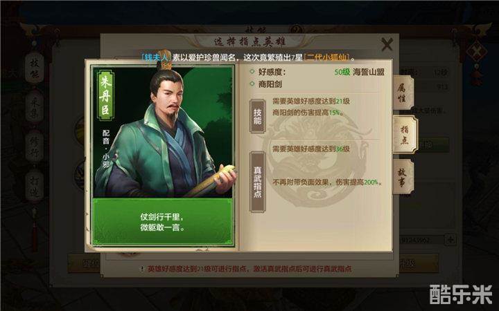 技能介绍 商阳剑是六脉神剑中最凶猛的一剑,对目标造成伤害的同时,令目标获得商阳剑伤状态,每秒损失你攻击力60%的血量,若目标移动则不会受到伤害。 朱丹臣的真武指点不再附带负面效果,伤害提高200%。 南海鳄神的真武指点是商阳剑伤同时附带50%的减速。 段正淳的真武指点是商阳剑同时减少目标2%的气。 段誉的真武指点是商阳剑可以叠加最多5次。