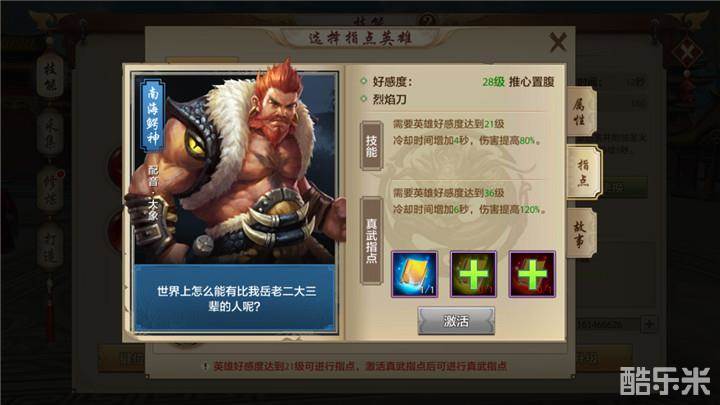 点评:南海鳄神的真武指点和朱丹臣的真武指点一样,都是提升输出的真武指点。不过南海鳄神的真武指点更加简单粗暴,以冷却时间增加为代价,提升烈焰刀的伤害输出。和朱丹臣的真武指点相比,虽然提升量不高,但是好在容易触发,适合新手明教少侠。