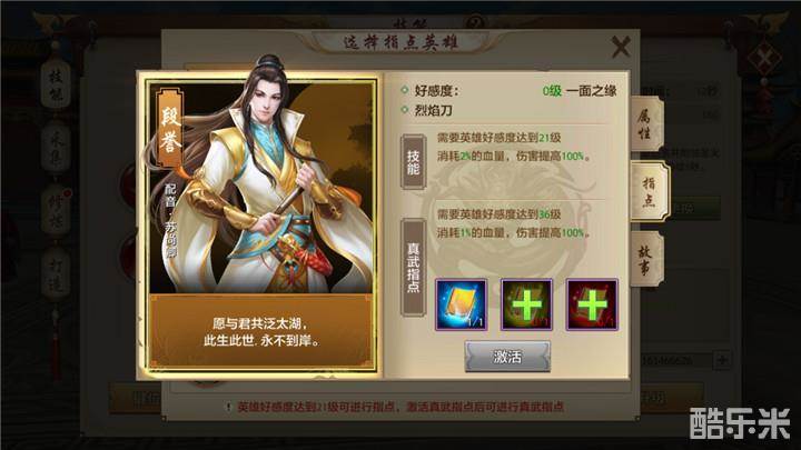 点评:段誉的真武指点也是提升输出的真武指点,不过代价是牺牲一定血量。如果和回复血量的技能搭配使用,就可以做到收益最大化。同时伤害提升量较高,触发也比较容易,就是释放前需要留意自己的当前血量。