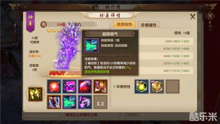 现在江湖中就有这么一个技能,是按照伤害百分比吸气的,那就是珍兽技能吸气,神兽的超级吸气技能,效果是攻击时20%概率减少敌人的气,减少数值为此次伤害的37%,曾有大神的神兽一击就吸光了目标的气。如果我们是很多普通少侠攻击敌人一个战力超高的大侠的话,那吸气类技能可能有较好的效果,不间断控制+珍兽吸气+吸气技能,可以让敌对的大佬完全放不出技能,这么看的话八门和指点江山的吸气技能其实也是有用的。