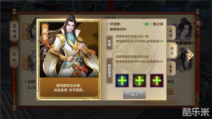 【段正淳真武指点:不再造成伤害,而是摧毁目标一定数值的气,并回复同样数值的气】 段正淳真武指点是一个非常有意思的指点,使用段正淳指点后,暴雨梨花针不再造成伤害,而是消耗敌人气的,如果能消耗敌人大量的气那也不错,但是实际使用中发现,耗气量极低,他并不是按照原技能伤害的百分比降气,降气数值是随着技能等级提升而提升的,在实战中效果不是很好,所以这个指点几乎没有人使用。