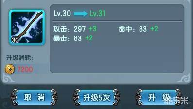 玩家使用金币可对装备进行升级。装备等级越高,属性越强。装备的等级受掌门等级的限制。每件装备的成长属性均不同。