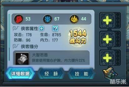 在侠客详细资料面板右侧的每个装备孔右侧,均有一派小孔,这排小孔就是装备宝石孔。