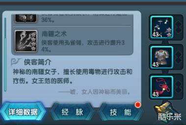 侠客可在战斗中施放大招!每个侠客有3个主动技能,2个被动技能。这些技能的作用各不相同,有的是纯攻击性技能,有的则附加控制类的效果(比如眩晕啦,点穴啦)。而被动技能,有的是加强侠客的属性,有的则是增加侠客的特殊效果。