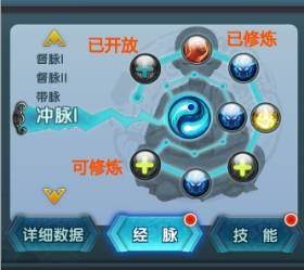 修炼经脉是侠客获得战斗力提升的重要途径之一。进入侠客经脉栏,可以查看侠客当前的经脉修炼情况。绿色的加号表示当前可以修炼,蓝色的加号表示已开启经脉点,还缺少部分材料。