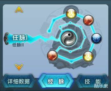 如下图所示:左边经脉列表显示当前侠客已打通和正在打通的经脉。而通过经脉气波牵引的右边,显示当前选择经脉具体穴位的打通情况;每个圆球表示一个当前经脉上的穴位。