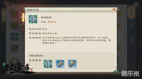 想要获得宝藏,就要付出比别人更多的努力,“掉宝副本”就是这样一个付出才有回报的玩法。想要进入“掉宝副本”,少侠需要完成日常任务,累计活跃度,达到一定的活跃度,才可以进入副本,探索宝藏。