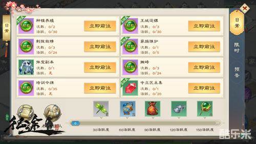 活跃度的累积实也非常简单,只需完成日常任务,就能累积到足够多的活跃度了。日常任务包括运镖、刺探敌情、太庙搬砖、种植养殖等,都是非常经典的玩法,可以帮助少侠尽快上手游戏,活跃度奖励也非常丰富。