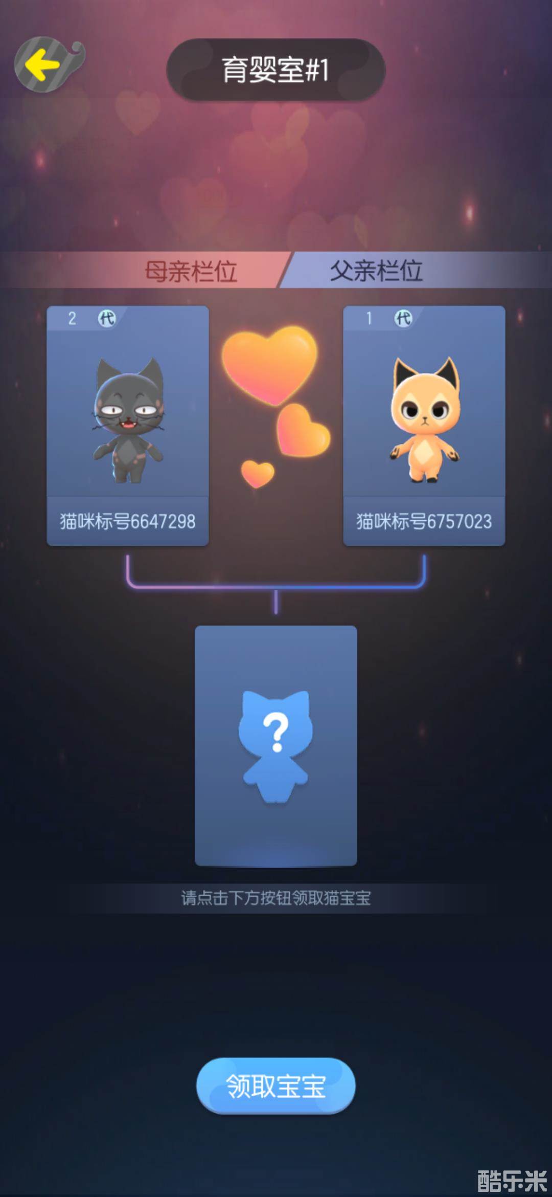 猫咪可公可母,需要消耗一个繁育房子,当放置母亲位置时,那么邀请好友进入父亲位置,就可以生猫宝宝了,所生的猫宝宝归母亲,父亲则获取一座繁育房子。所产生的二代猫咪,甚至三代猫咪,都可以和好友继续繁育哦。