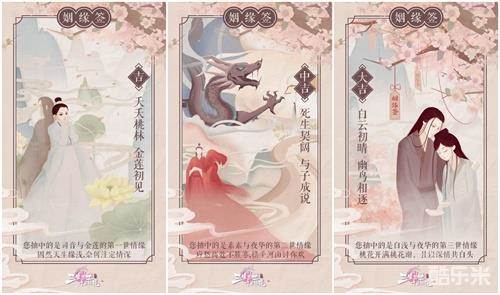 伴随着白浅、夜华“三生三世”故事的展开,最终仙友们将能测出自己的桃花缘属于他们的哪一世的姻缘,又将代表感情的顺利程度。无论最终的姻缘签是大吉还是中吉,只要坚定信心与TA相随到白头,无论缘深缘浅都不会留下遗憾。相信仙友们都能找到最爱的TA,共同闯荡这个大荒世界。