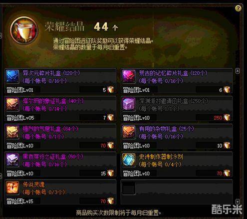 另一方面,可以加速角色养成的冒险团荣耀结晶也是我们需要积攒的对象,荣耀结晶商店中购买黑夜穿行之证可以让我们的哈林史诗加速成型,也可以兑换异次元碎片礼盒与荒古记忆礼盒,让我们在升级途中更加顺畅。
