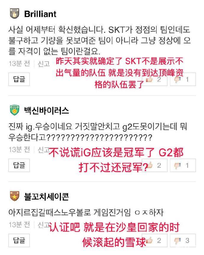 在SKT遭到G2双杀之后,SKT的表现也遭到了韩国网友的热议: