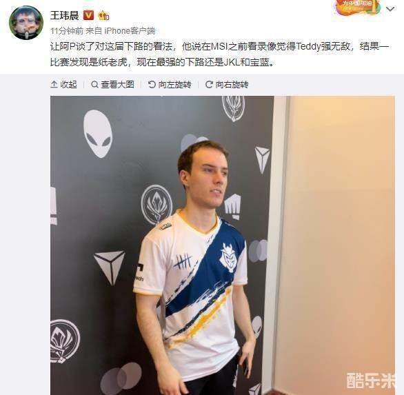 根据体坛周报记者的透露,Perkz表示:在MSI之前看了赛区的比赛录像,觉得SKT的ADC选手Teddy强无敌,但是打了比赛后发现只是纸老虎,现在认为最强的下路是IG的JKL和宝蓝。