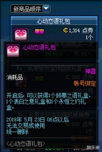 废话不多说,接下来也是进入正题,520表白礼包名为心动恋语礼包,仅在5月20日当天出售,在商城花费1314点券即可购买。下面说一说礼包的内容,礼包包含3个礼盒:倾慕之语礼盒、表白之意礼盒和永恒之约礼盒。
