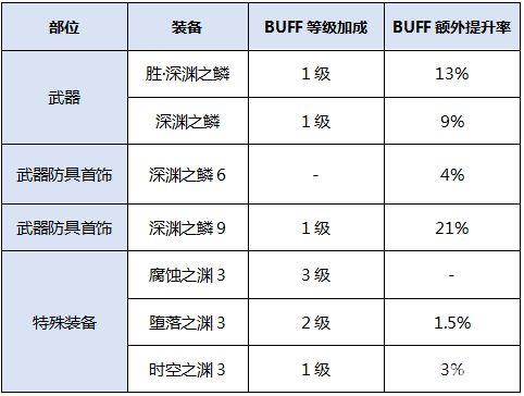 下表为不同搭配的装备带来的等级、额外提升率。【深渊之鳞+胜·武器+时空之渊】为完美换装。