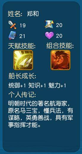 游戏中,传奇船长除了拥有自己独一无二的技能外,和某些特定的传奇船长组合,还可发挥组合技能,达到1+1>2的效果;在游戏中,“郑和”和“郑石氏”则是固定搭配,可激发组合技能“卧虎藏龙”。