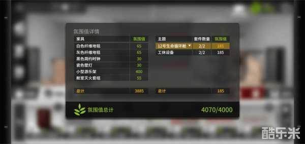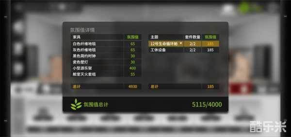 ②4000:考虑到铺墙纸,铺两块地毯,铺地砖,可以最大提供240+240+2*65=610氛围度,放5个叠叠高的情况下,已然有3785氛围度。墙饰上可以挑选自己喜欢的挂上去,或者摆几张桌子箱子椅子即可达到4000。