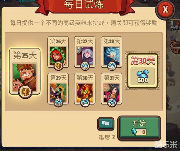 2.每日试炼 每日试炼会有钻石产出,挑战的天数越高获得的钻石越多,第30天挑战成功会获得500宝石奖励。