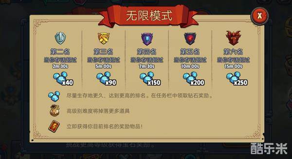3.无限模式 无限模式玩法中会根据生存时间,发放相应排名宝石奖励。