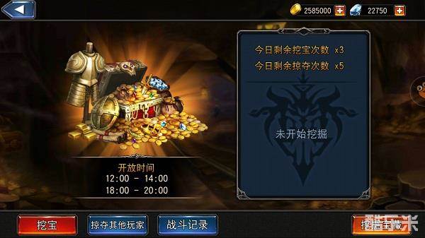 初始每天有3次挖宝和5次掠夺的机会,玩家每天、每次挖宝可获得随机的丰厚宝藏,若对此次宝藏不满意也可花50钻进行重转。也可花钻石购买挖宝和掠夺次数。