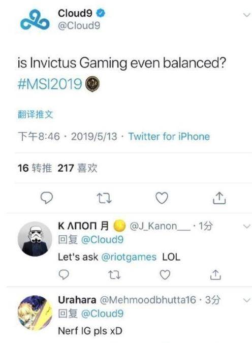 其实不光光是LPL这边在吹IG,海外各大战队选手也早就不遗余力的吹起来了,比如C9在看了IG和G2的比赛之后,发推特表示:IG现在是否影响了游戏的平衡?底下有很多欧美观众跟风,艾特拳头官方推特,要求削弱IG。