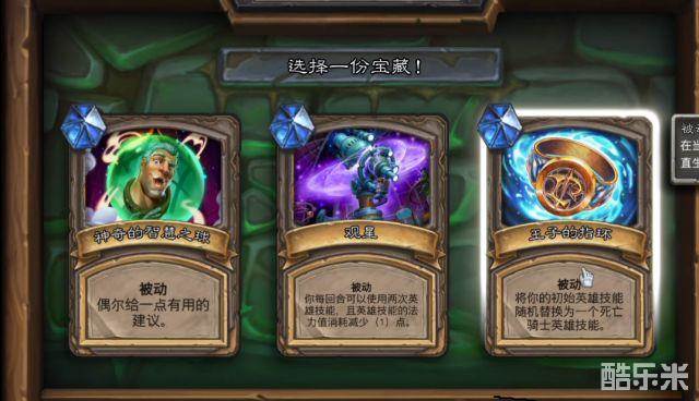 当满足一定条件后,宝藏牌的效果才会触发。现已知的效果是,每场对局中,当对方第一次打出一张随从牌之后,为你召唤3张嘲讽随从;当你第一次施放一张法术时,再释放一次(目标随机)。