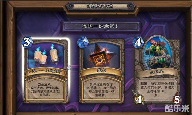 “达拉然大劫案”中仍然延用了炉石冒险模式中一贯的传统——每一关结束之后能够在三组牌中选择一套加入自己的牌组,每两关则会出现宝藏牌的三选一。