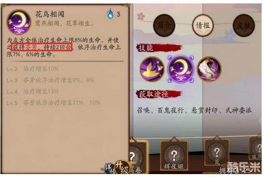花鸟卷的三技能才是她主要作为奶妈的加血技能,团血下去的时候可以稳一下血线,之后会给友方添加一个持续治疗的buff,萤草的光合作用以及蝴蝶精的蝶舞,效果是差不多的。不过主要加血还是一技能最好。