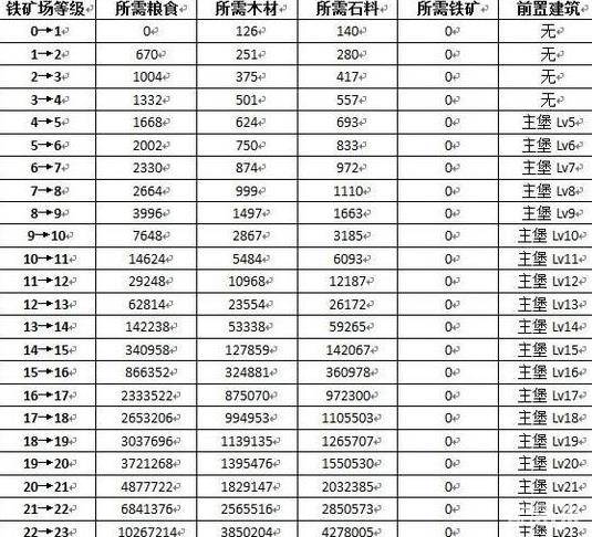 消耗一定的粮食、木材与石料资源,并在前置建筑主堡达到一定等级的条件下即可为铁矿场提升等级,大幅提升领地铁矿产出效率。铁矿场升级不需消耗铁矿。