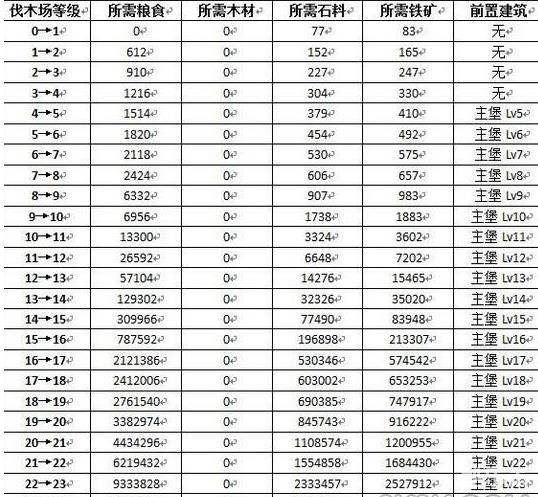 下面带来伐木场升级所需资源一览: