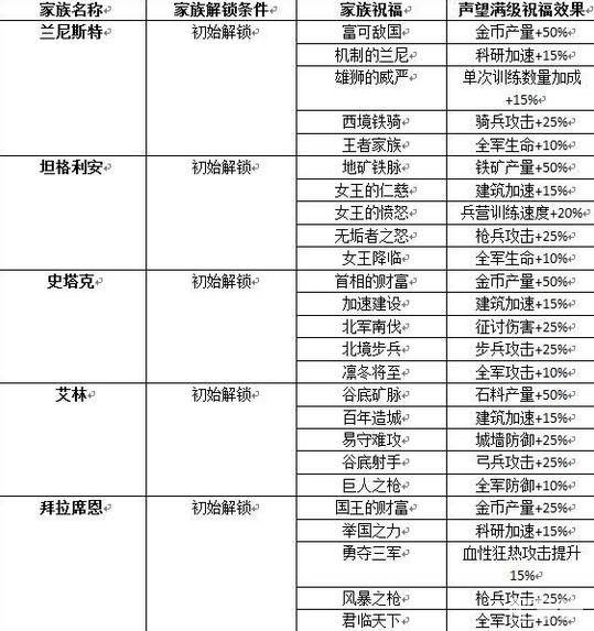 权力的游戏手游家族阵营解锁家族声望与祝福一览