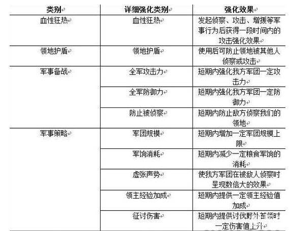 在这些强化类别中,[血性狂热]在主堡9级以上即可获得,即在主堡9级以上后,发起对领地、营地、采集点或城堡的侦察、攻击、增援、驻扎、集结或指挥官换防等时,都可获得[军事狂热],并获得一定的全军攻击力加成,加成时间以主堡等级决定,并随主堡等级提升而增加。其中主堡等级9~12时,获得持续2分钟的全军攻击力加成;主堡等级25满级时,获得持续15分钟的全军攻击力加成。攻击加成还可通过科技研发提升效果;停战协定、移民、国战期间的跨国迁移等功能,需等状态结束后使用。
