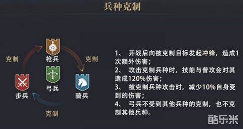 游戏中,骑兵克制的是步兵,可以在开场发起冲锋后,造成1次额外伤害,在后续战斗中多造成20%的伤害,并减少来自被克制兵种10%的伤害。