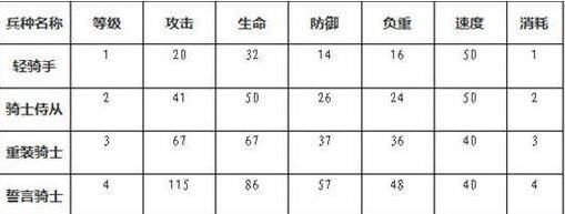 游戏中骑兵的图标是蓝色盾牌上一个孤零零的马头。骑兵共有5级分别是轻骑手、骑士侍从、重装骑士、誓言骑士、圣剑骑士。骑士在前中期有着和枪兵相似的生命与防御,以及稍高攻击力,但是到后期,攻击力会比枪兵高不少。同时还有着更高的速度与负重,横看竖看都是骨骼清奇适合当运输采集大队的好苗子,有趣的是,随着攻防能力的提升,骑兵不仅在外形上成为了重骑兵的模样,速度也因为坚盔厚甲而降低了,不过再慢毕竟是4条腿,还是比步兵快的(数据仅供参考,以实际版本为准)。
